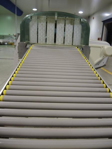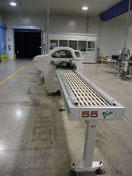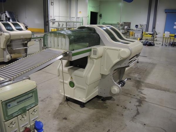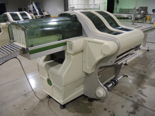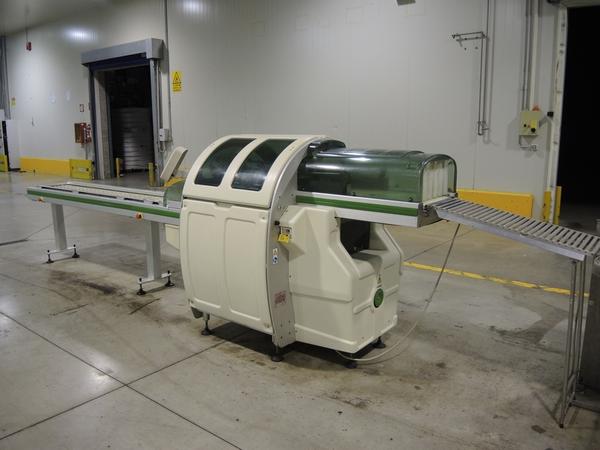 Automatic wrapping machine for strech technology for trays of different shapes and sizes. Productivity of 55 packages / minute. Equipped with adjustable feeding extension in width of 200x40 cm and outgoing roller conveyor.