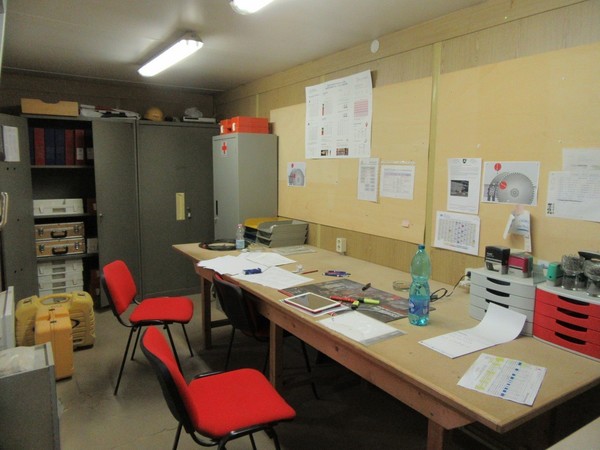 Office CTX Bml 20, serial 030304241 about 610x210x210 cm, with table, metal cabinet, light shelf and two red fabric chairs (11)