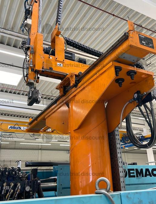Demag 420T plastic injection molding machine, year 1998, with three injection slides and robot.