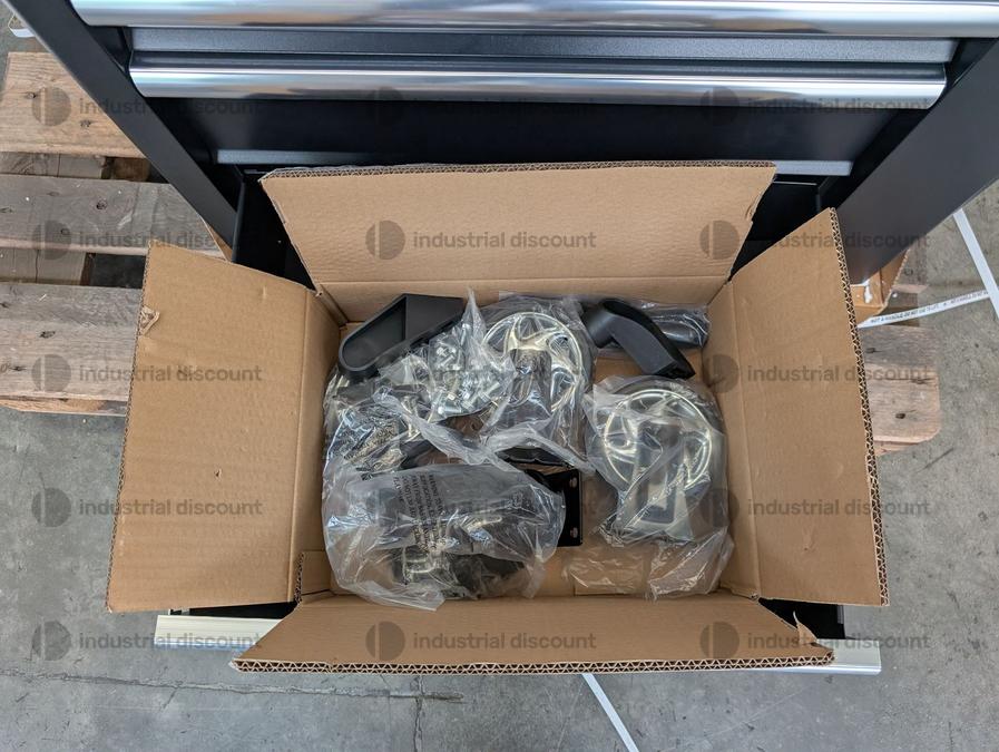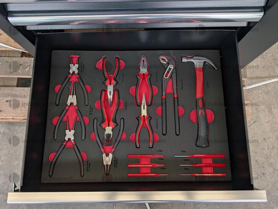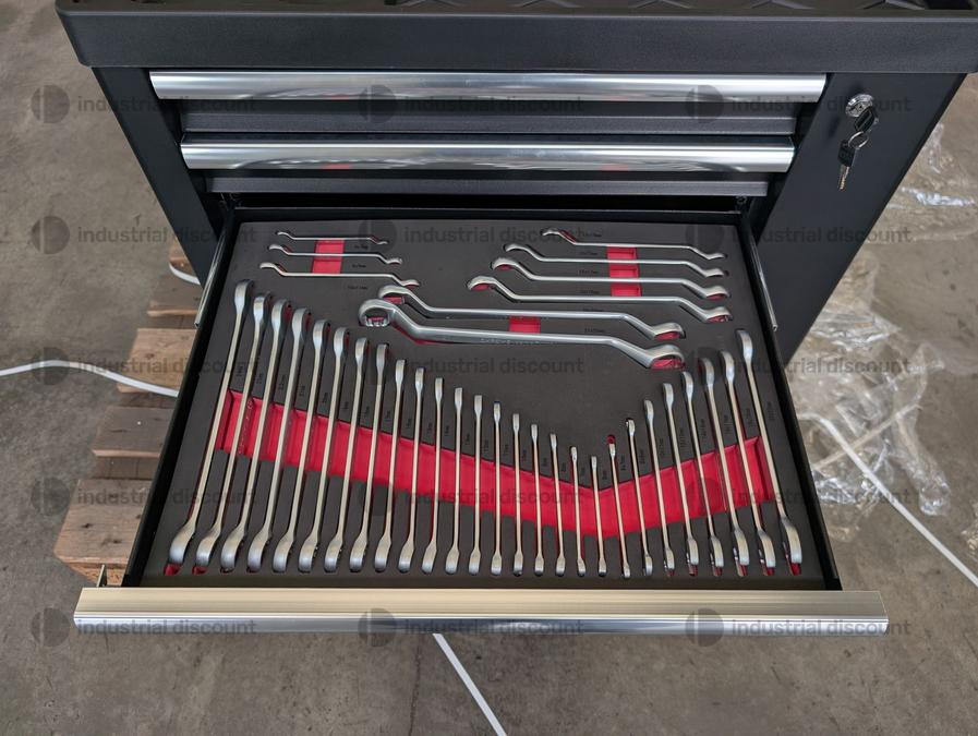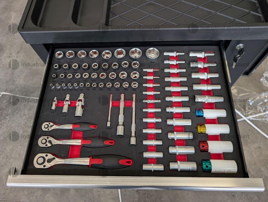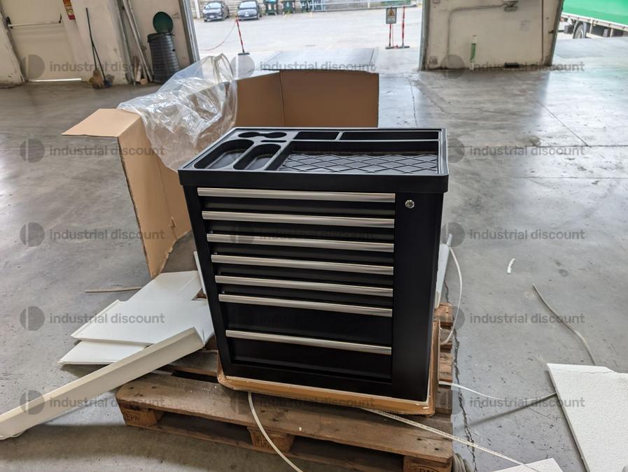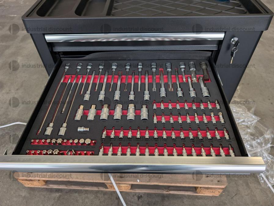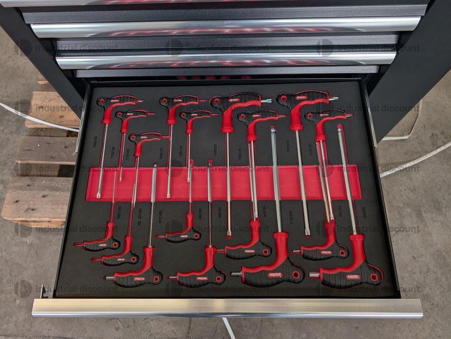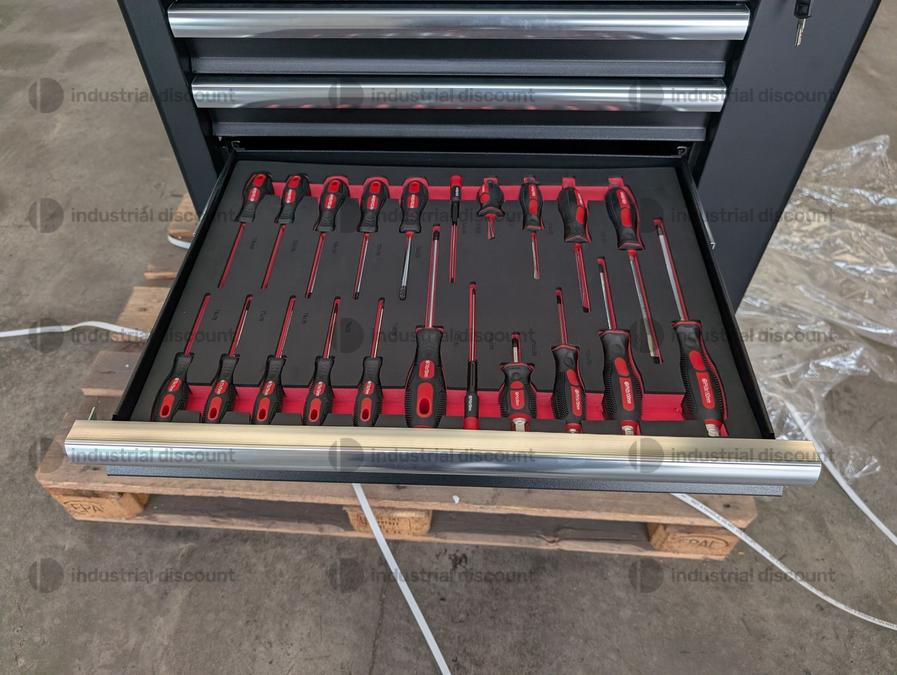 Professional tool trolley with a set of 280 tools. Maximum trolley load: 475 kg, maximum drawer load: 35 kg. 7 drawers with centralized lock.