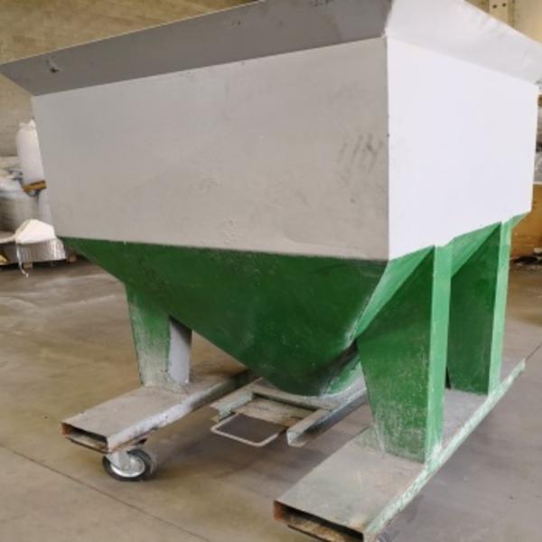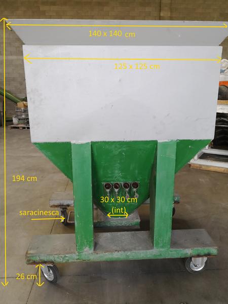 N.2 silo / hopper container with fork forks forklift and 4 swivel wheels, used, excellent conditions, for dosed emptying of medium / fine grain material, sturdy structure, closing with sliding gate manually sliding on the base of the funnel, 4 side ways.