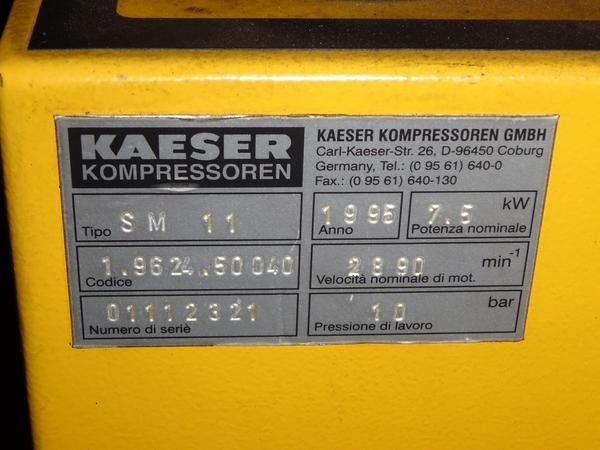 Kaeser SM11 compressor, serial number 01112321, built in 1995, complete with tank and Aquamat-2.