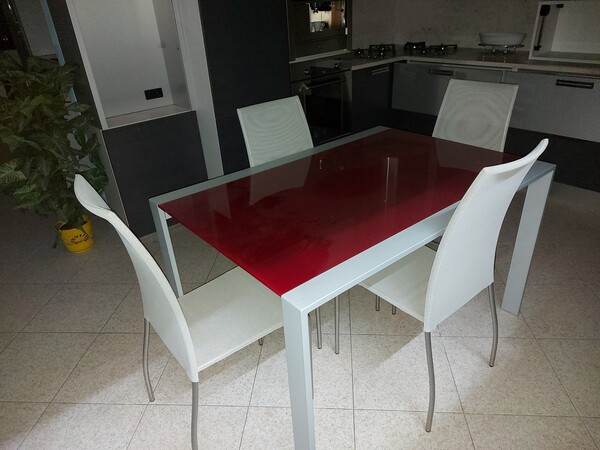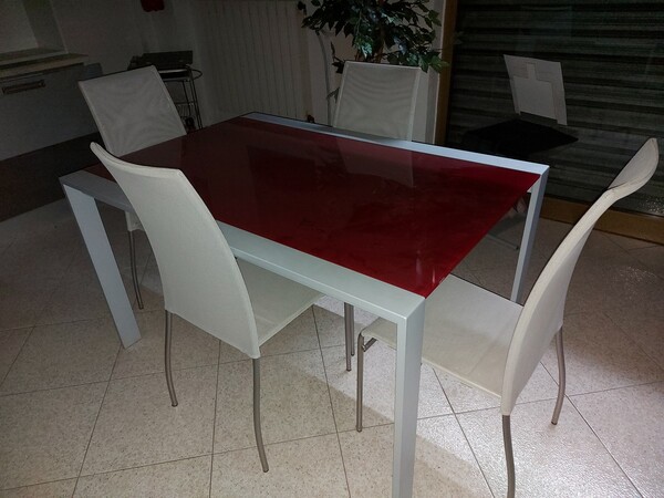 Lot composed of corner modular kitchen in gunmetal colored wood, development 480 (180 + 300) x 60 x h 210 cm equipped with appliances (oven, coffee machine, 6 burner hob, hood, steel sink) including table in red and gray metal dimensions 130 x 90 cm including four gray chairs.