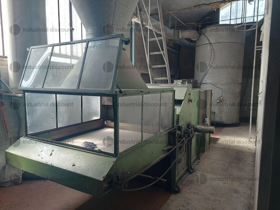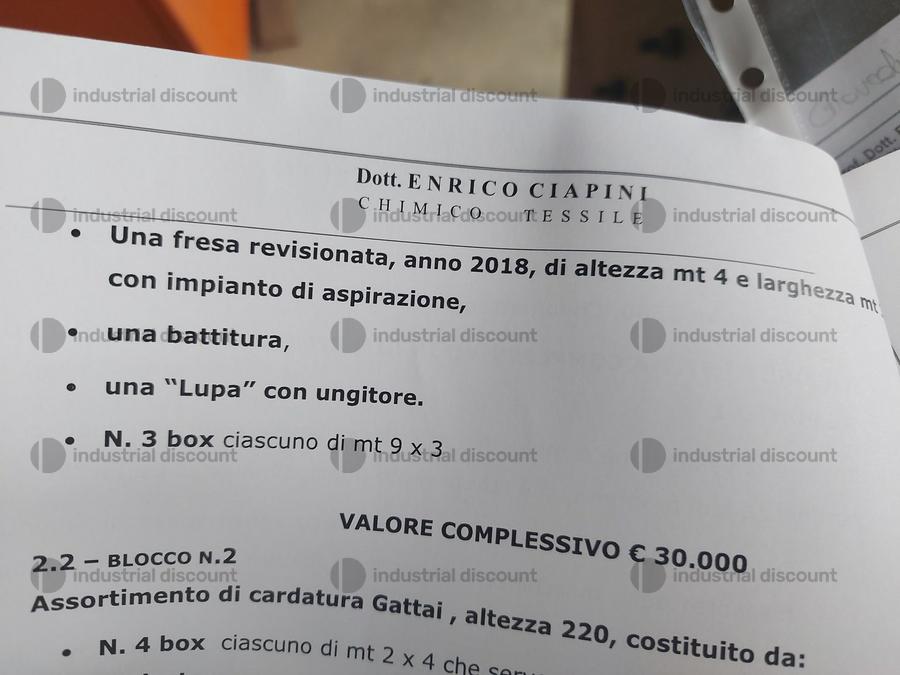Gatta Carding Assortment Lines 220 cm high consisting of 4 boxes each measuring 2 00 x 4 00 m serving the assortment 1 Loader Double front assembly consisting of a first small breaking machine with rigid linings very effective for coarse raw materials and a second actual front assembly with elastic linings A first cross 1 breaking machine consisting of 8 elastic pairs also Gattai brand A second cross 1 breaking machine also consisting of 8 pairs like the first 1 Staple press cross 1 Crosspiece with 9 pairs Staple press Cross 1 Forecarder with 10 pairs Staple press Carding machine with 10 pairs Staple press 1 wire collection barrel 3 dividers 220 cm high with 208 wires with divisions equipped with a vacuum cleaner to collect broken wires 2 with 10 pairs and one with 9 pairs 1 Demag 50 HP cleaning pump and a 25 HP pump with a container to recover oil from the aforementioned Demag pump 2 grinding benches for cylinder sharpening SALES NOTES Please note that Lot 1 includes the total of the goods included in Lots 2 3 4 5 6 7 8 9 and 10 Please note that the award is subject to acceptance by the Procedure Authorities If the individual lots and Lot 1 as a whole have equal prices Lot 1 as a whole will have priority COLLECTION NOTES Maximum expected collection time from the agreed date 20 days We recommend using the following vehicles for collection Crane trucks skids or tanks or forklift with adequate capacity