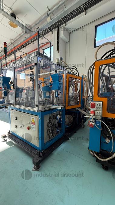 Vertical injection molding machine with rotary table, plastic co-molding/overmolding on inserts, 4-station rotary table, servo-controlled electric table movement, 22 mm screw diameter, 18 ton clamping force.